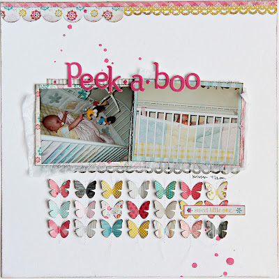 Marinette who only has boys in her family shows us how well you can make this work, pulling the blues, grays, and yellows. Throw in some ink splatters, stitching and stamping and we've got some amazing masculine layouts. She shows us that we don't ever have to be afraid of these girly looking kits, there always seems to be a way to make them work for you ;)